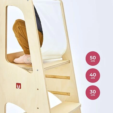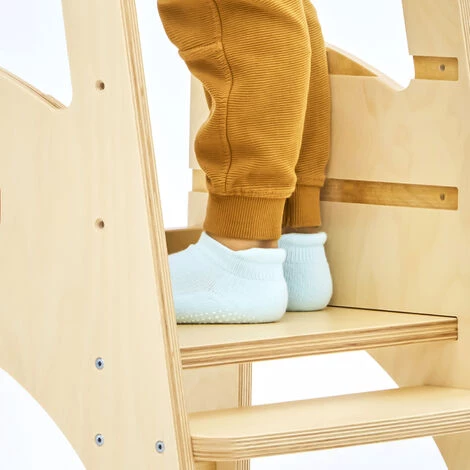 Outil d’accompagnement idéal à l’éveil et l’apprentissage, elle favorise l’autonomie de l’enfant dans le développement de ses facultés cognitives et motrices pour atteindre les hauteurs inaccessibles des adultes (plans de travail, cuisine, tables, lavabos, miroirs, étagères, etc).
