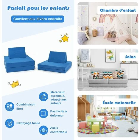 - Comprenant 2 tapis pliants et 2 oreillers triangulaires, ce canapé et cet ensemble de jeux créatifs permettent aux enfants de l’utiliser de multiples façons et de stimuler leur imagination et leur créativité. Ils peuvent construire un lit, un fort, un tunnel, une fusée et une maison de jeu ; convertissez le canapé en 2 chaises de sol et redevenez un canapé. Rempli d’éponge haute densité et haute résilience, cet ensemble de canapé offre un endroit ferme et confortable pour que les enfants puissent jouer à des jeux vidéo, regarder des films, faire une sieste, lire des livres, parler avec leurs amis, etc.