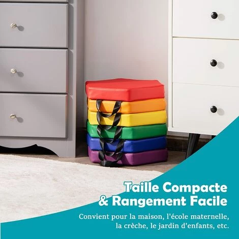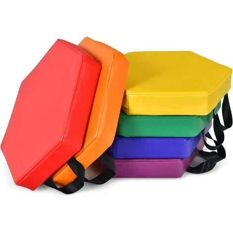 - Êtes-vous à la recherche d’un coussin de jeu d’enfant? Vous devez prendre notre lot de 6 coussins ronds de jeu d’enfant en mousse en considération. Pris la santé d’enfants en considération, le coussin sélectionne le PU et l’éponge recyclée comme matériau. Conçu spécialement pour les enfants, la mignonne dimension adopte parfaitement la taille des enfants pour que les enfants puissent s’asseoir confortablement et les couleurs vives de l’arc-en-ciel attirent l’attention des enfants. Achetez- la chez vous si vous adorez!