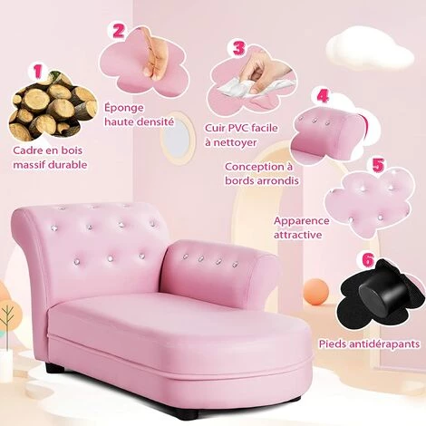 - Il s’agit d’un petit canapé conçu spécifiquement pour les enfants de 3 à 7 ans ! Le look rose, associé aux gemmes en cristal, fera que les enfants l’aimeront en un coup d’œil. La structure en bois et les pieds antidérapants garantissent la stabilité de la structure. La surface de la peau en PVC est facile à nettoyer. L’éponge de densité interne, combinée aux jolies gemmes en cristal, sécurise la position de l’éponge et garantit le confort du canapé. Il peut être placé dans le salon ou la chambre des enfants, ou il peut être utilisé dans les centres éducatifs.